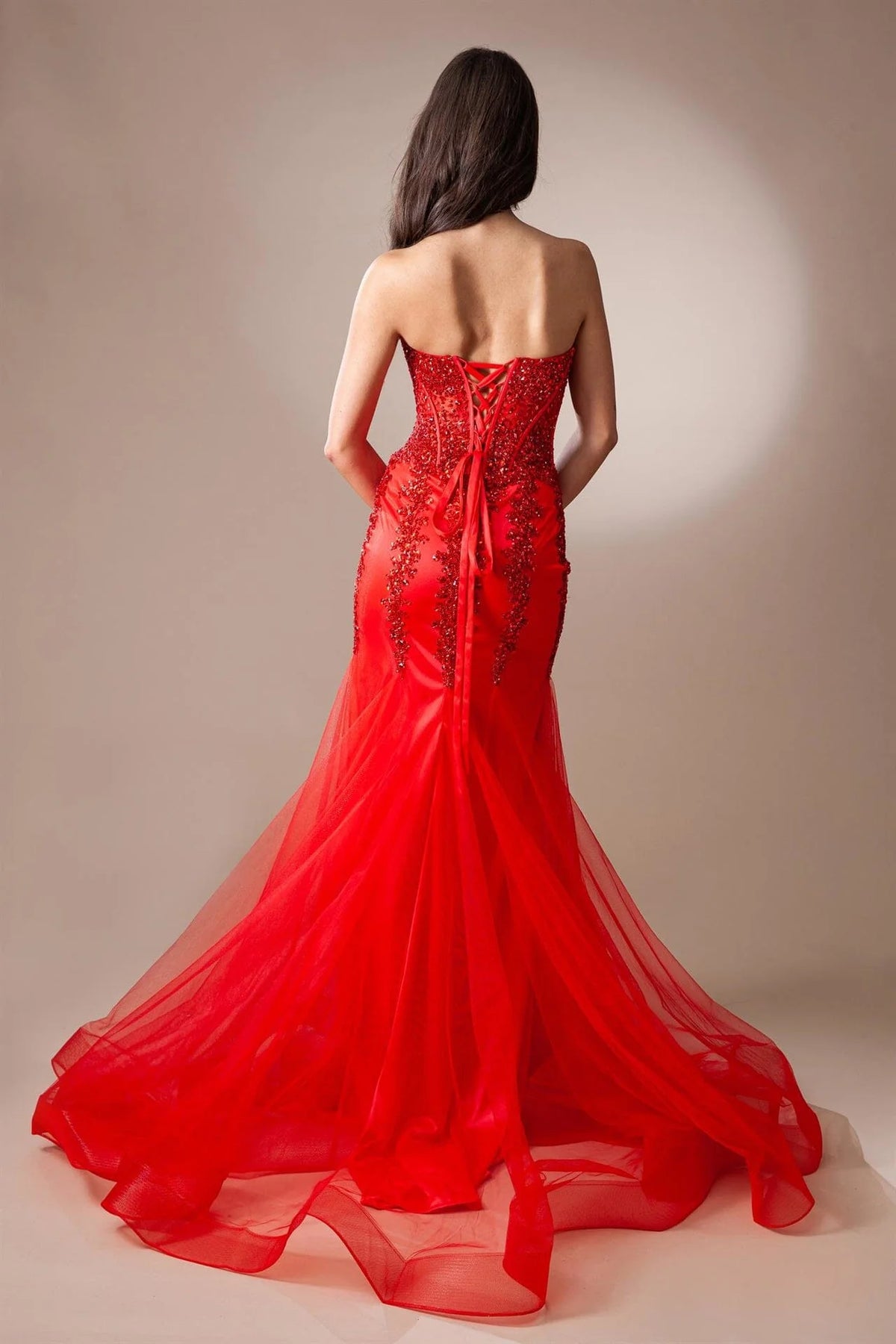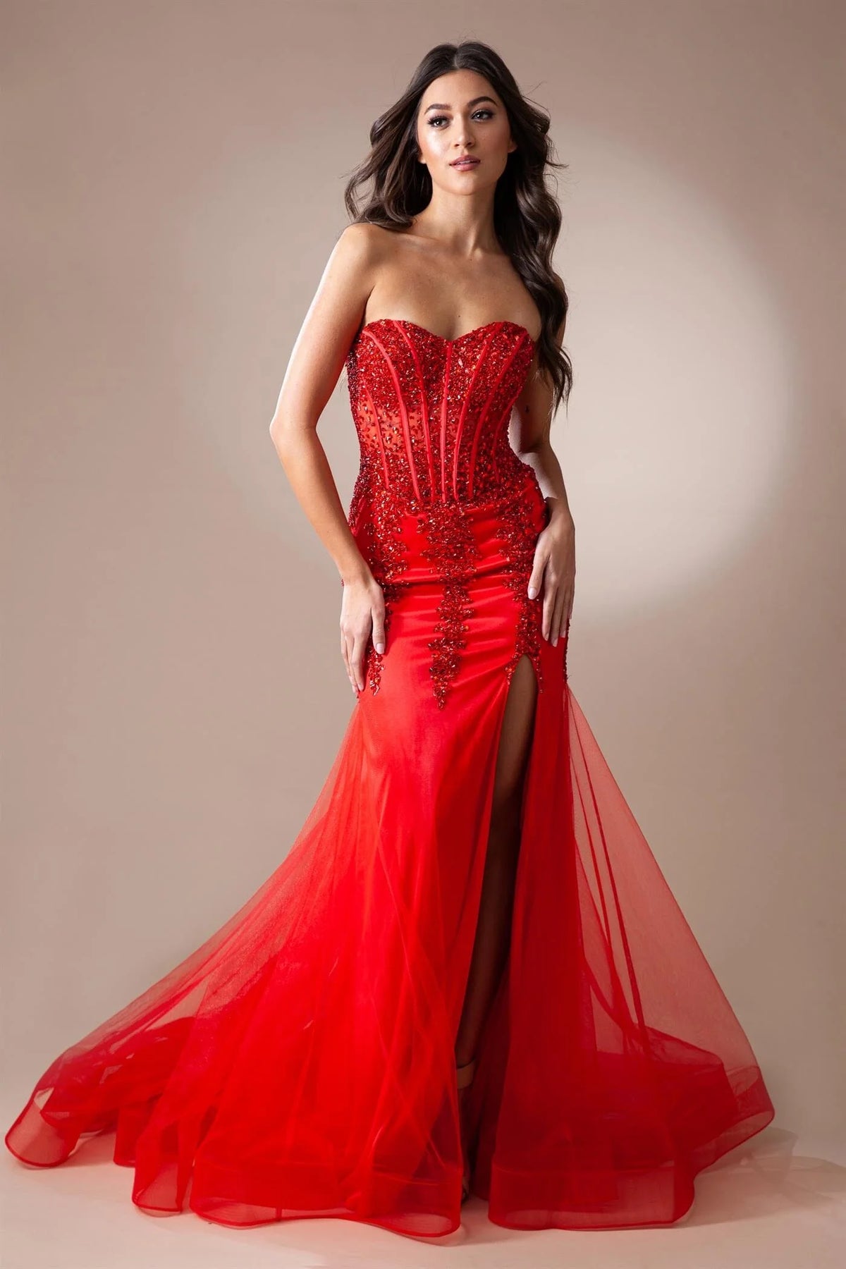 • Fitted Beaded Strapless Slit Gown by Amelia Couture 7051