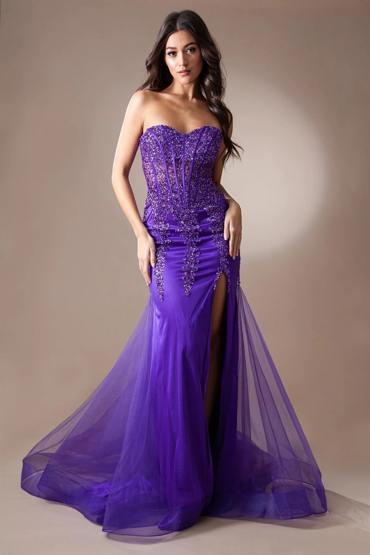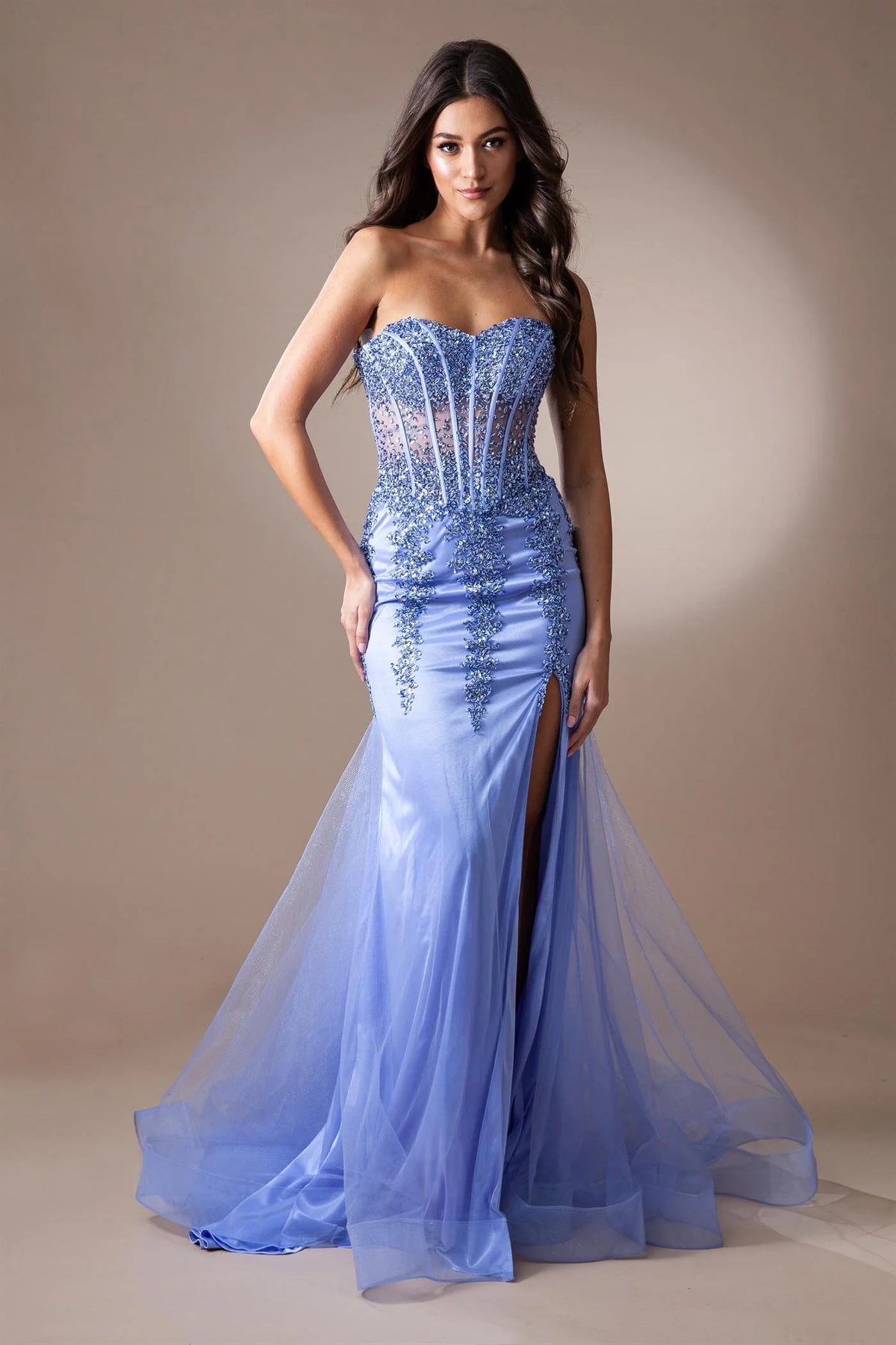 Have a magical moment in this beaded applique long strapless corset dress with fitted slit skirt by Amelia Couture 7051. This glamorous beaded slit gown features a strapless sweetheart corset bodice and a lace-up back closure.