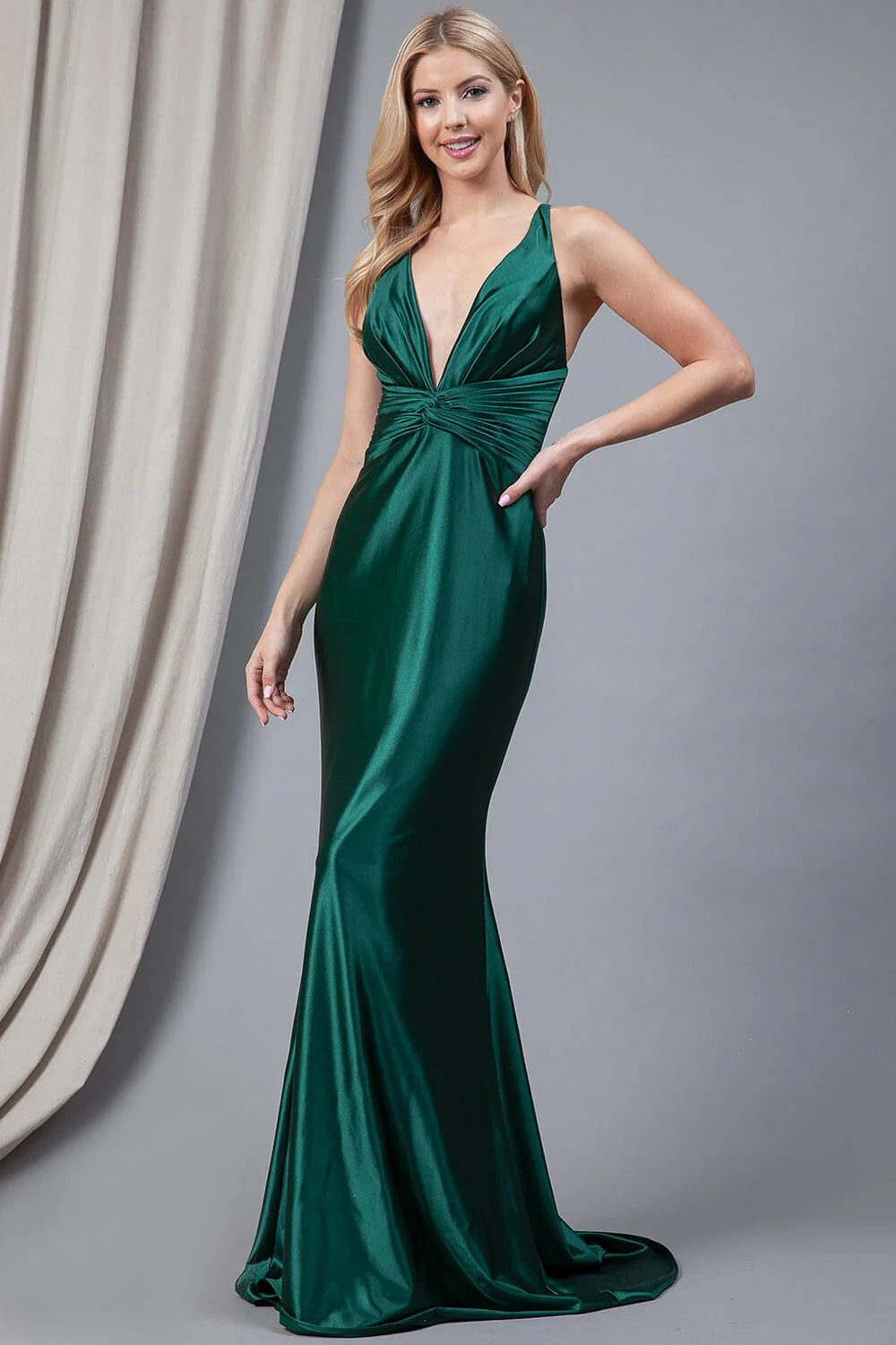 Command attention in this long sleeveless V-neck jersey dress with fitted skirt by Amelia Couture 5039.