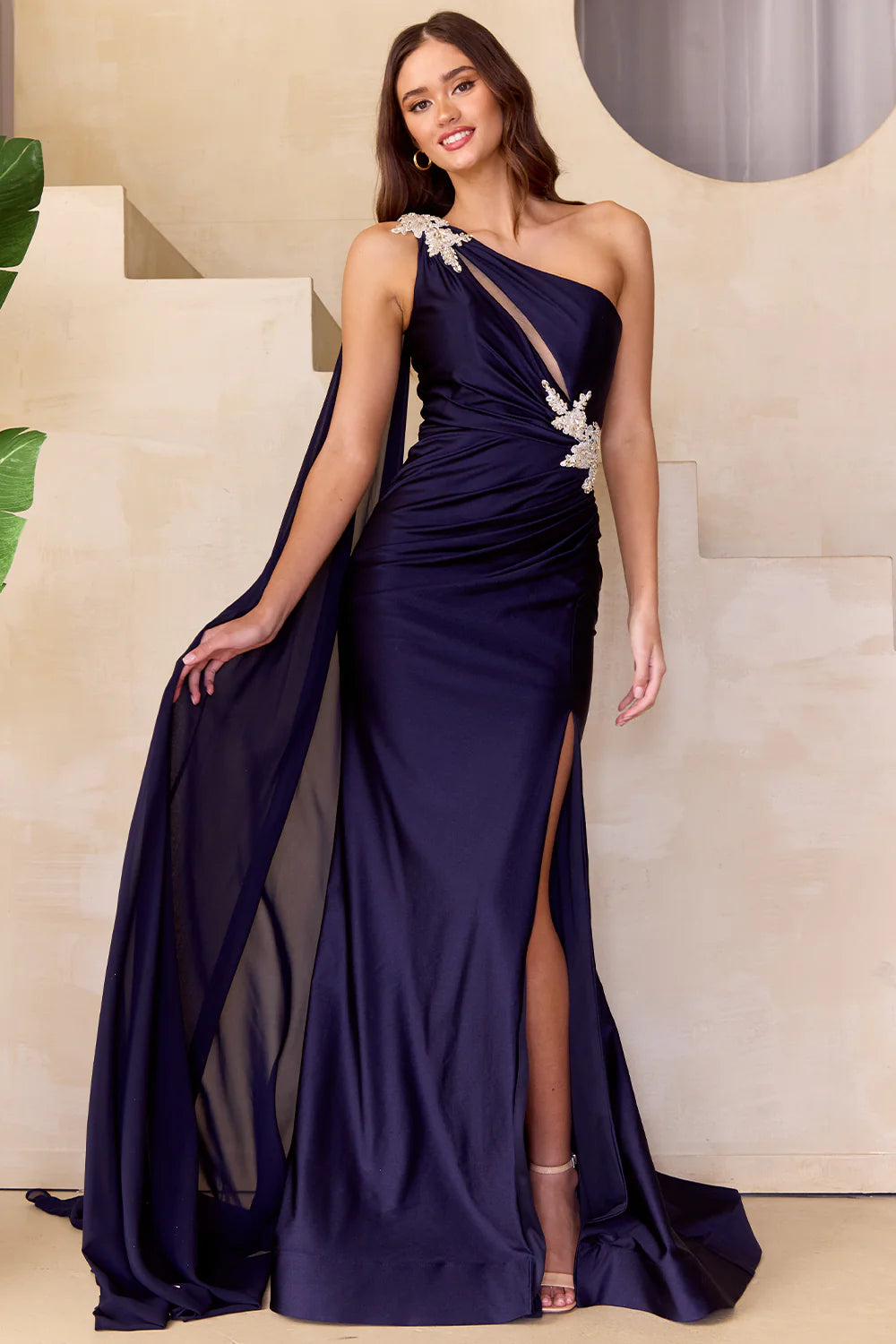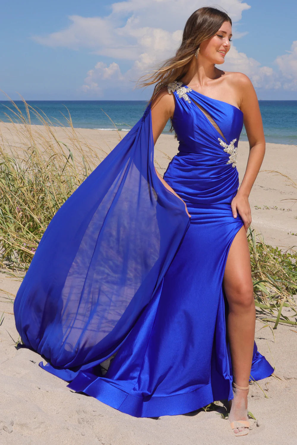 • One Shoulder Cape Slit Gown by Amelia Couture 7056