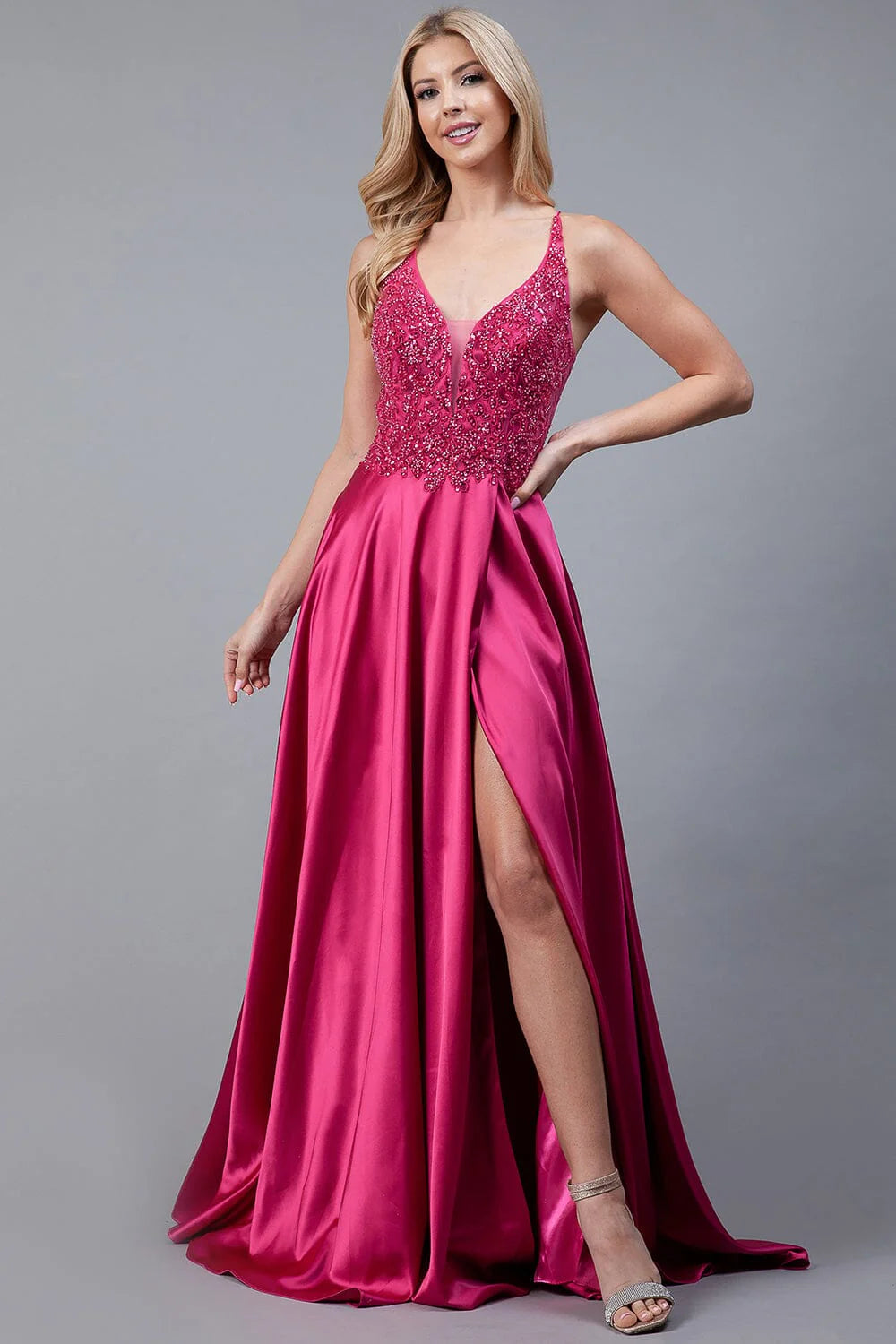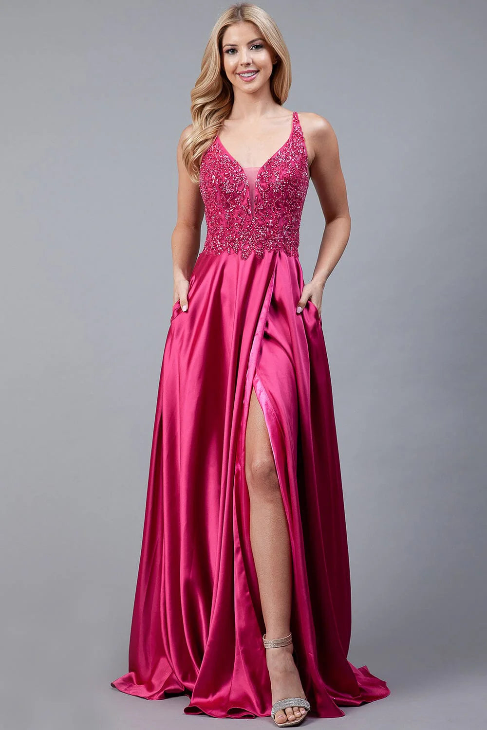 • Sequin Applique Satin Slit Gown by Amelia Couture 6120