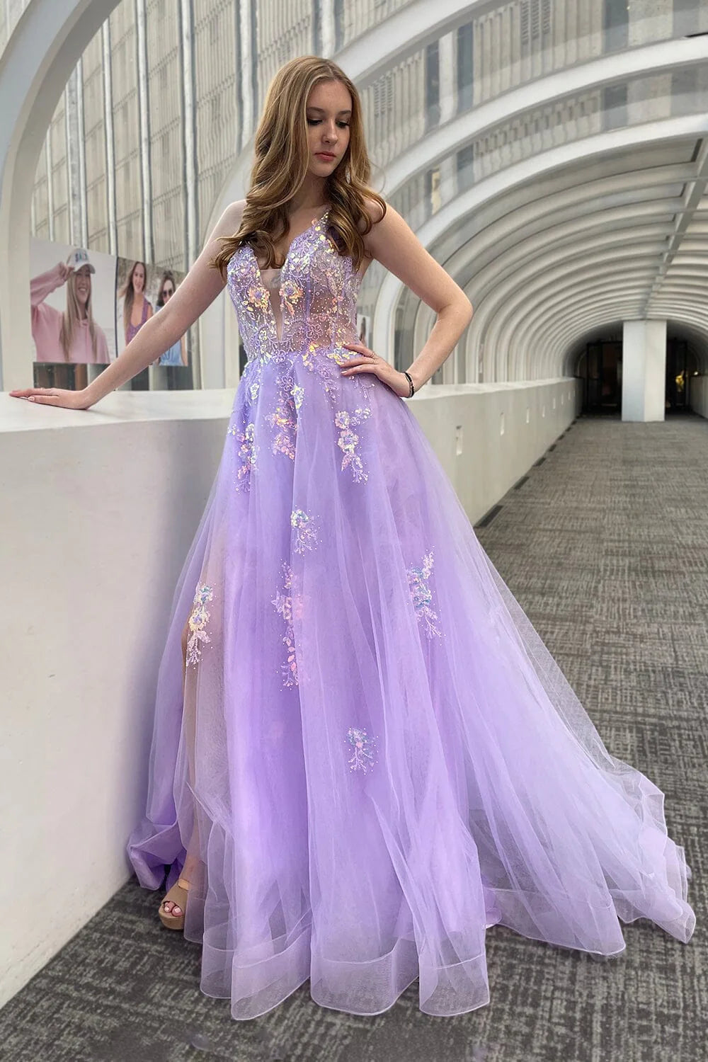 Look picture-perfect in this iridescent sequin applique long sleeveless dress with A-line slit skirt by Amelia Couture TM1003. Ethereal A-line ball gown with intricate sequin appliques all over the sheer deep V-neck bodice and an open strappy lace-up back.
