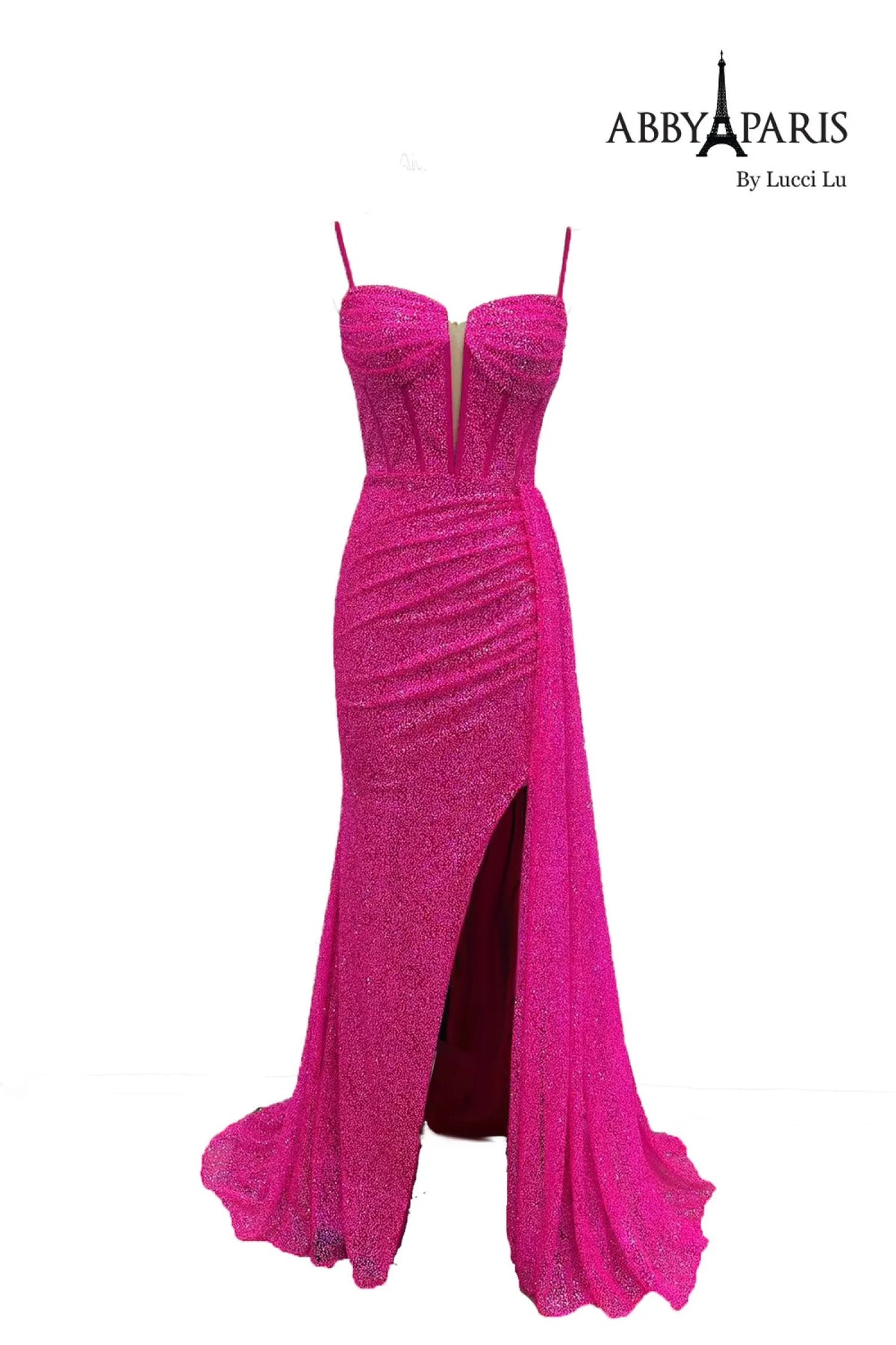 Sparkle and shine in this glitter embellished long sleeveless corset dress with a fitted slit skirt by Abby Paris 90266.