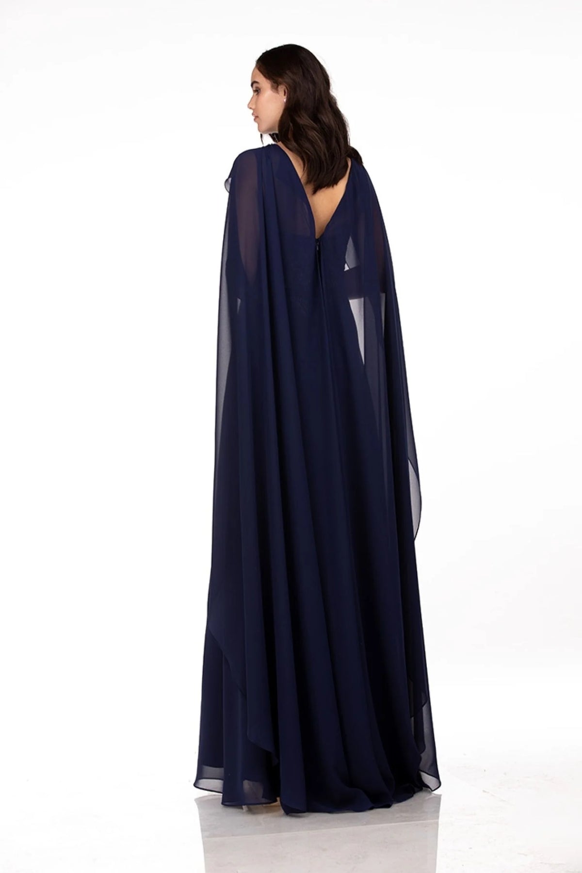 Look fashion forward in this lace bodice long cape dress with an A-line skirt by Abby Paris 96067.