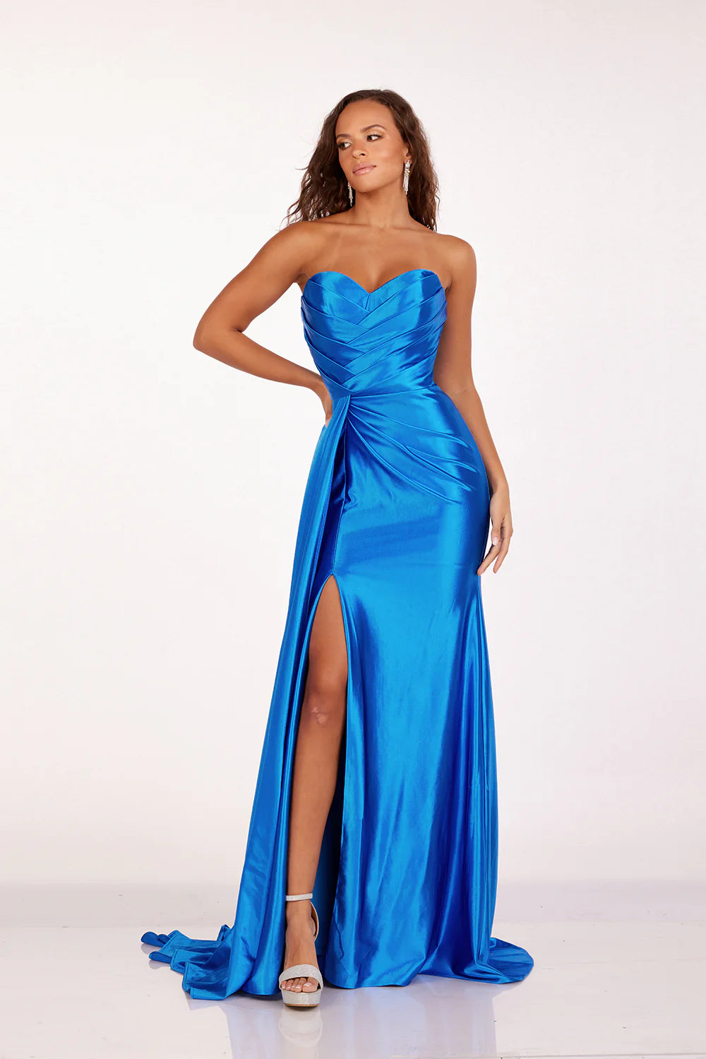 - Pleated Strapless Slit Gown by Abby Paris 90215